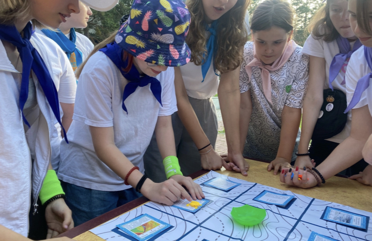 Диана с первых дней показала свою заинтересованность и ответственность, ознакомившись с правилами игры и реквизитом. Затем она помогла организовать игровое пространство у фонтана, создав уютную и атмосферную обстановку для участников игры.