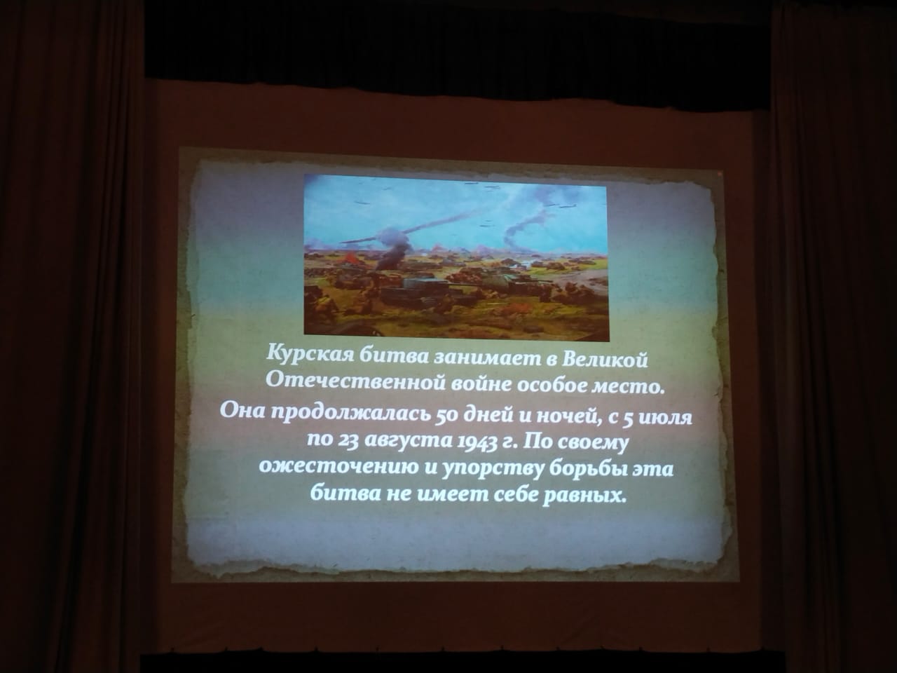 В ДОЛ "Яльчик" ГЖД прошло мероприятие, приуроченное ко ДНЮ ЕДИНСТВЕННЫх действий 80 лет Победы на Курской дуге.Все отряды приняли активное участие. Вспомнили и исполнили песни военных лет.В зале атмосфера была торжественная и трогательная.Мы и наши дети должны знать и помнить историю. Чувство патриотизма и гордости за нашу страну должно быть в каждом сердце ребенка .