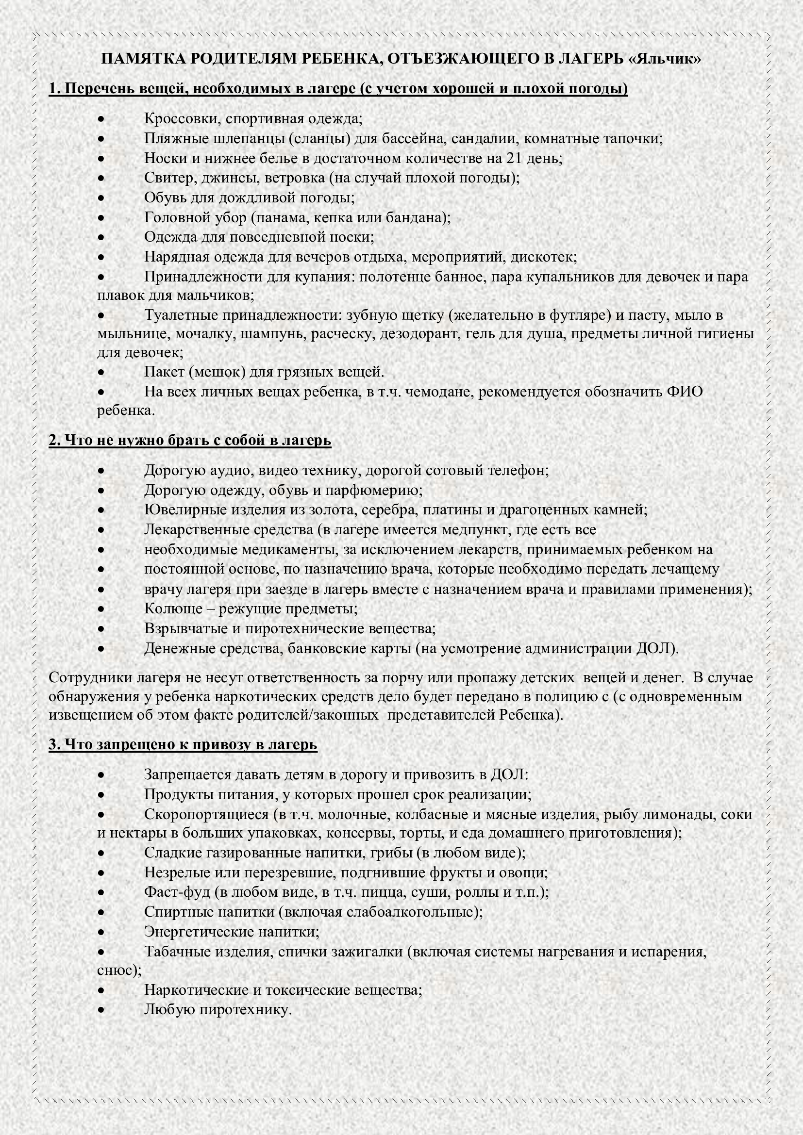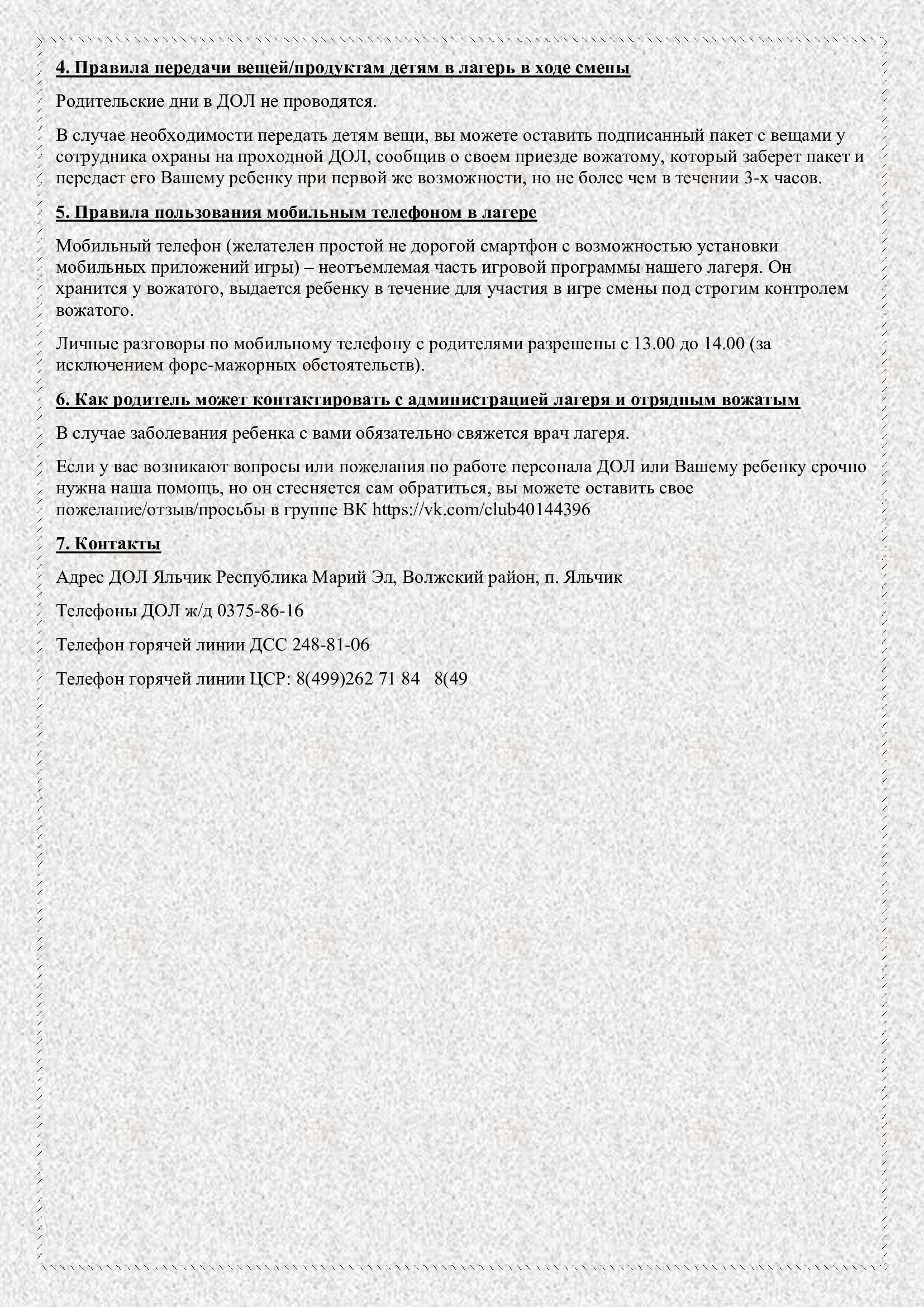 - Правила передачи вещей/продуктам детям в лагерь в ходе смены