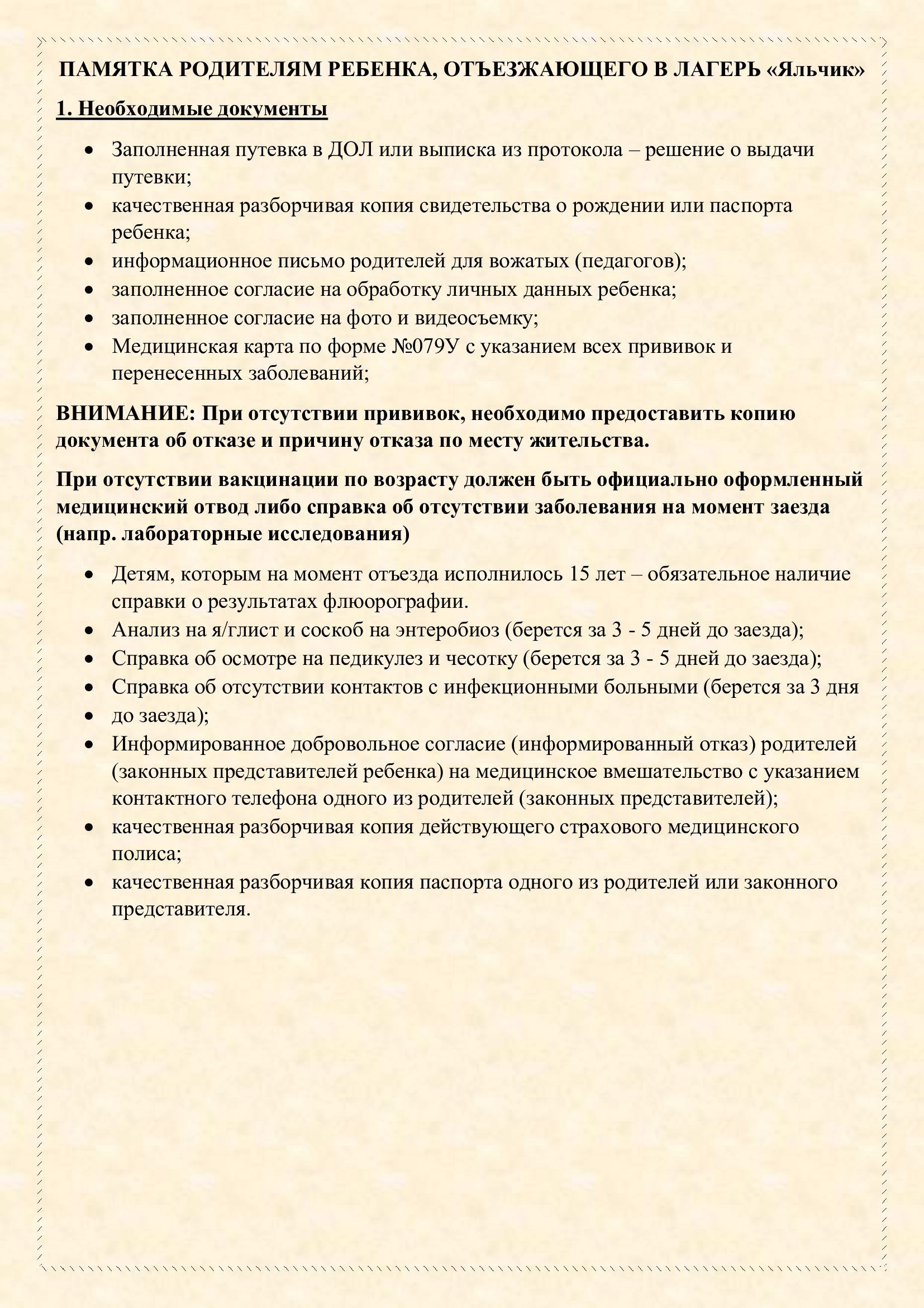 - - Справка об осмотре на педикулез и чесотку (берется за 3 - 5 дней до заезда);