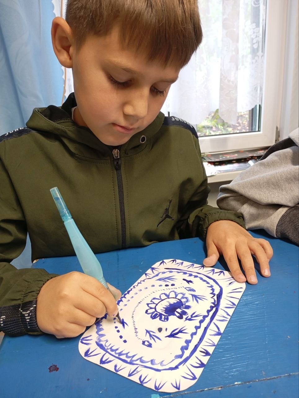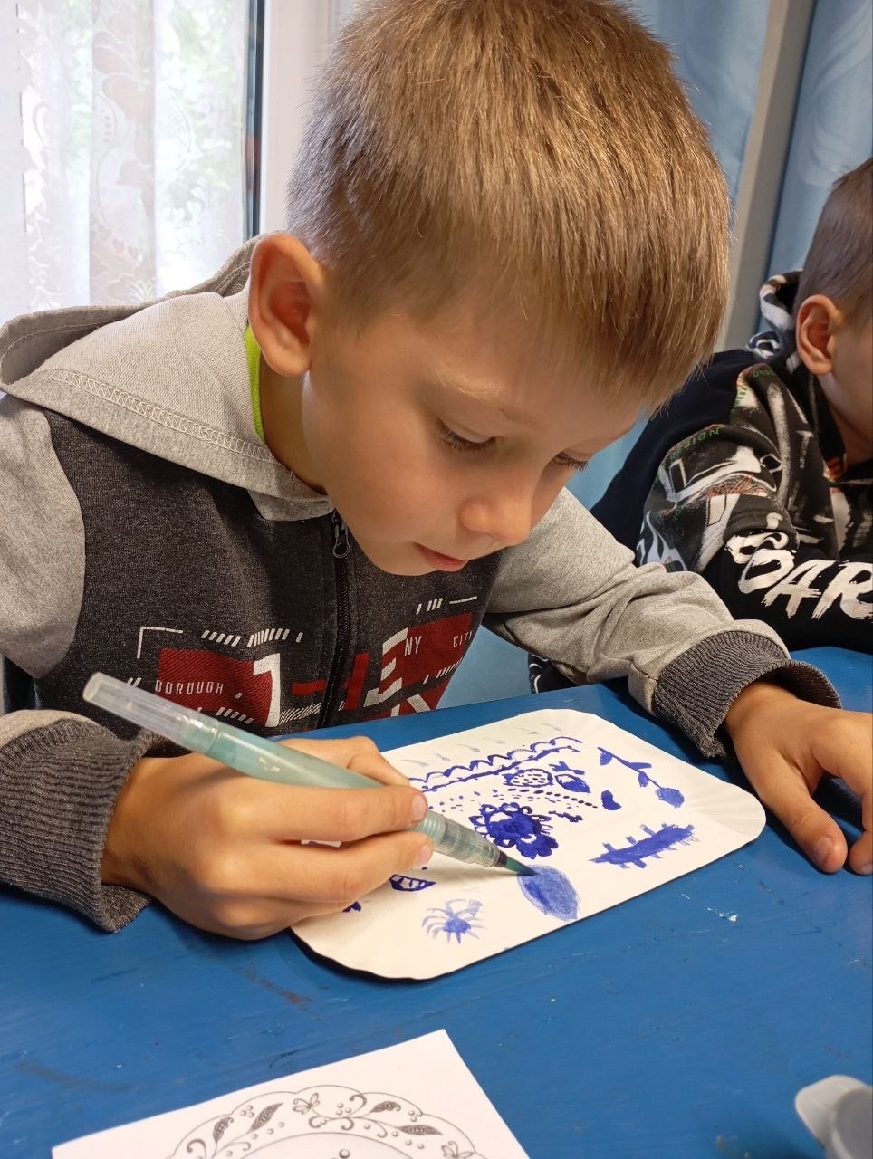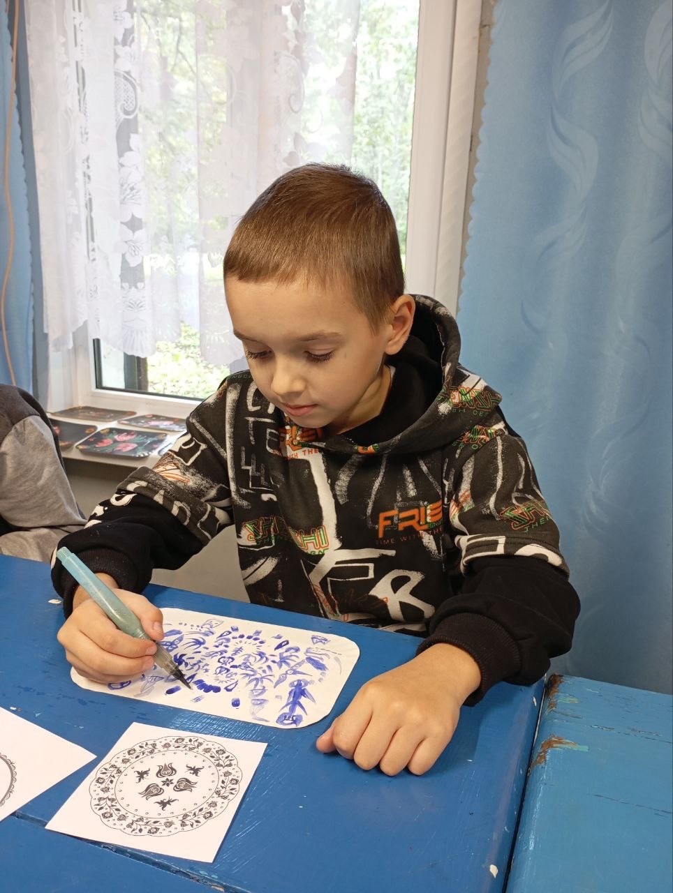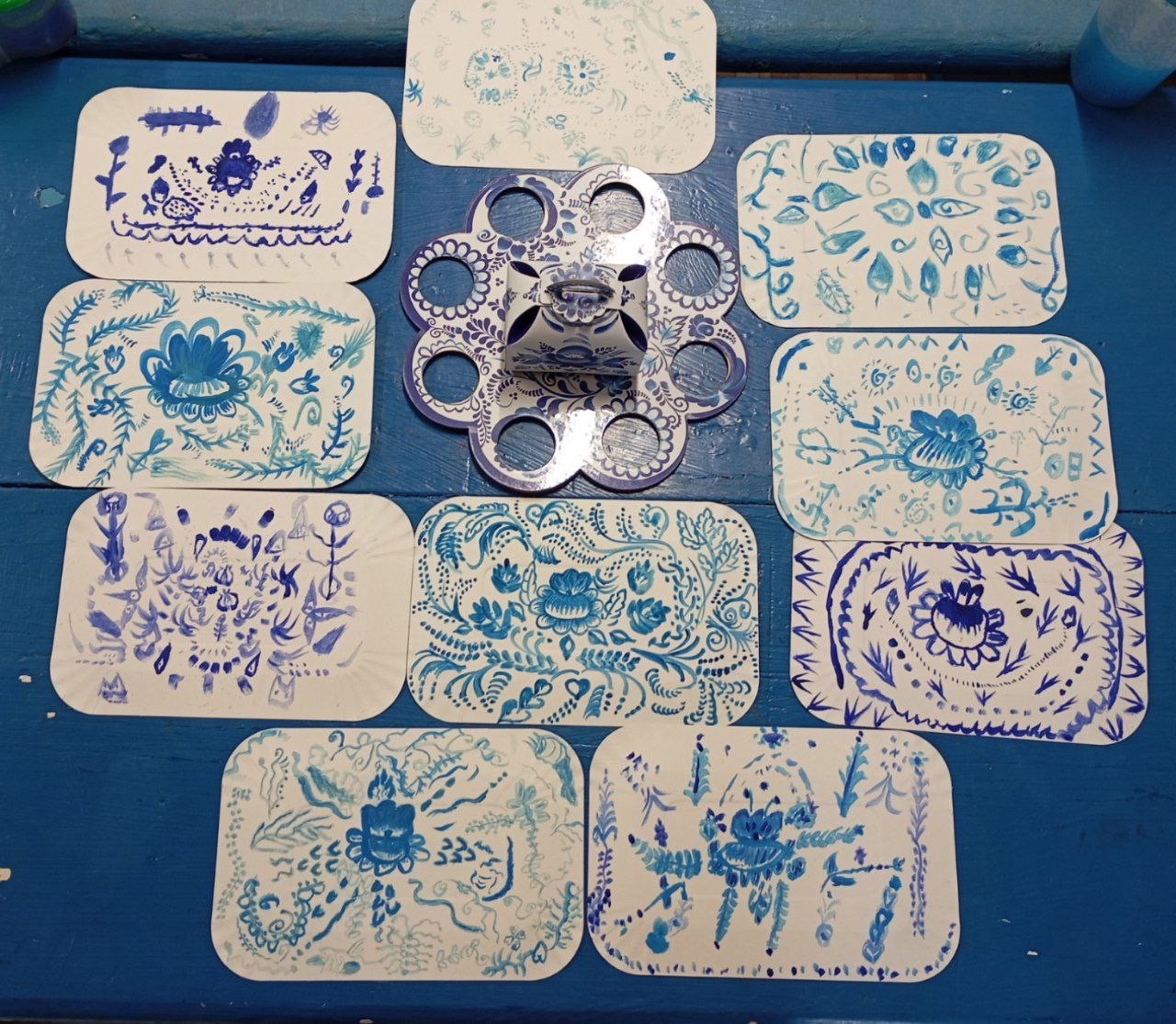 Сегодня маленькие очумельцы послушали сказку о братьях, расписавших белую шубу голубым орнаментом самому деду Трескуну, а потом попробовали создать свой орнамент в этой технике.