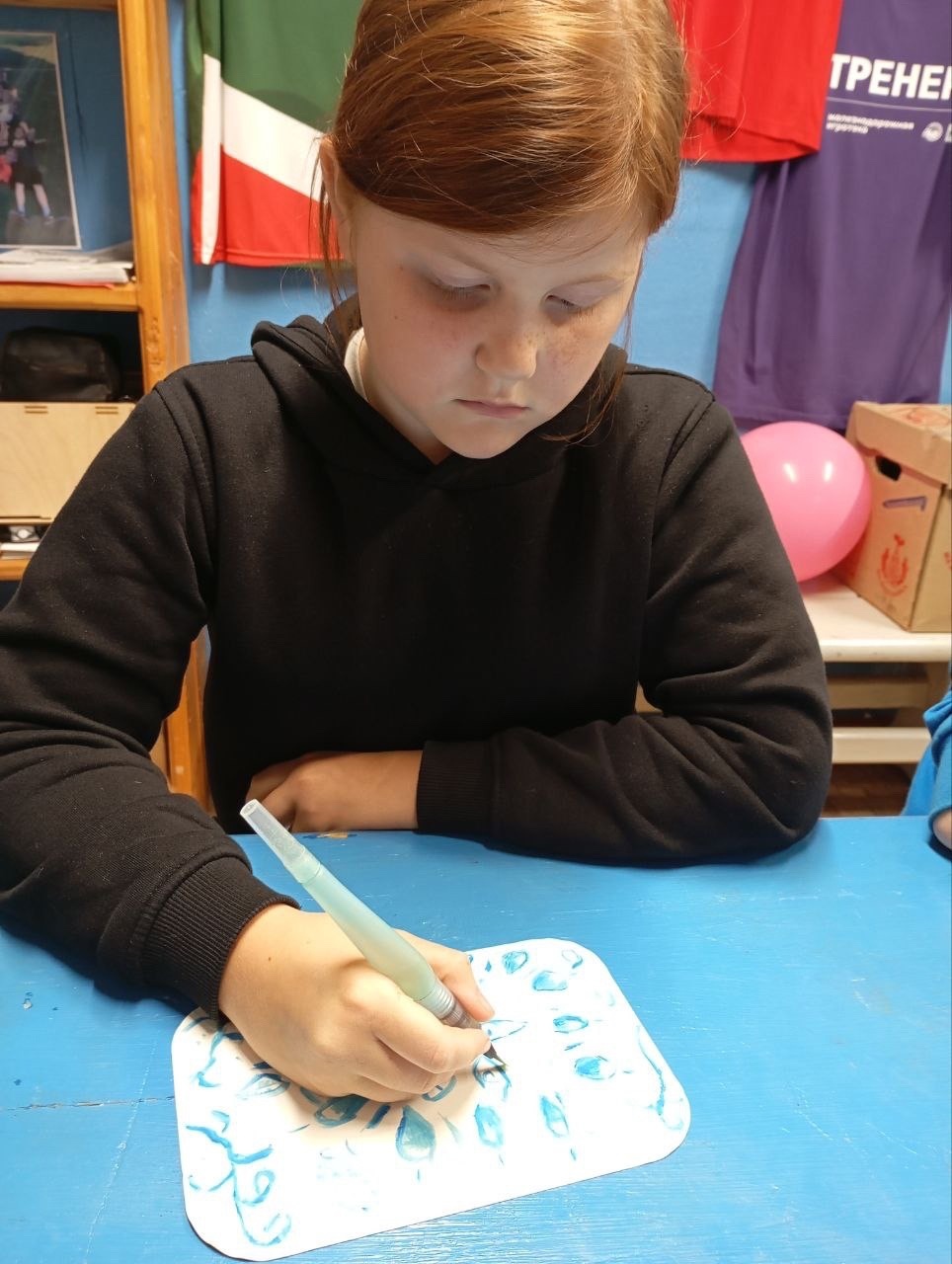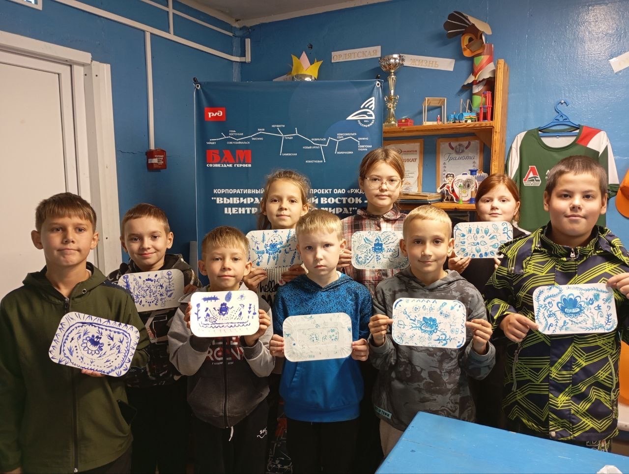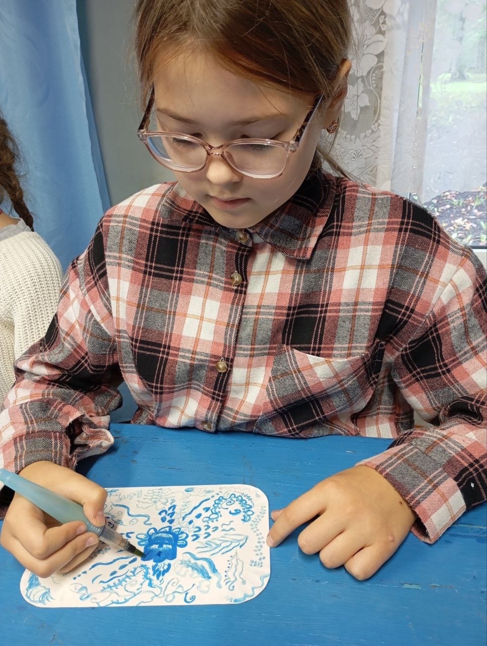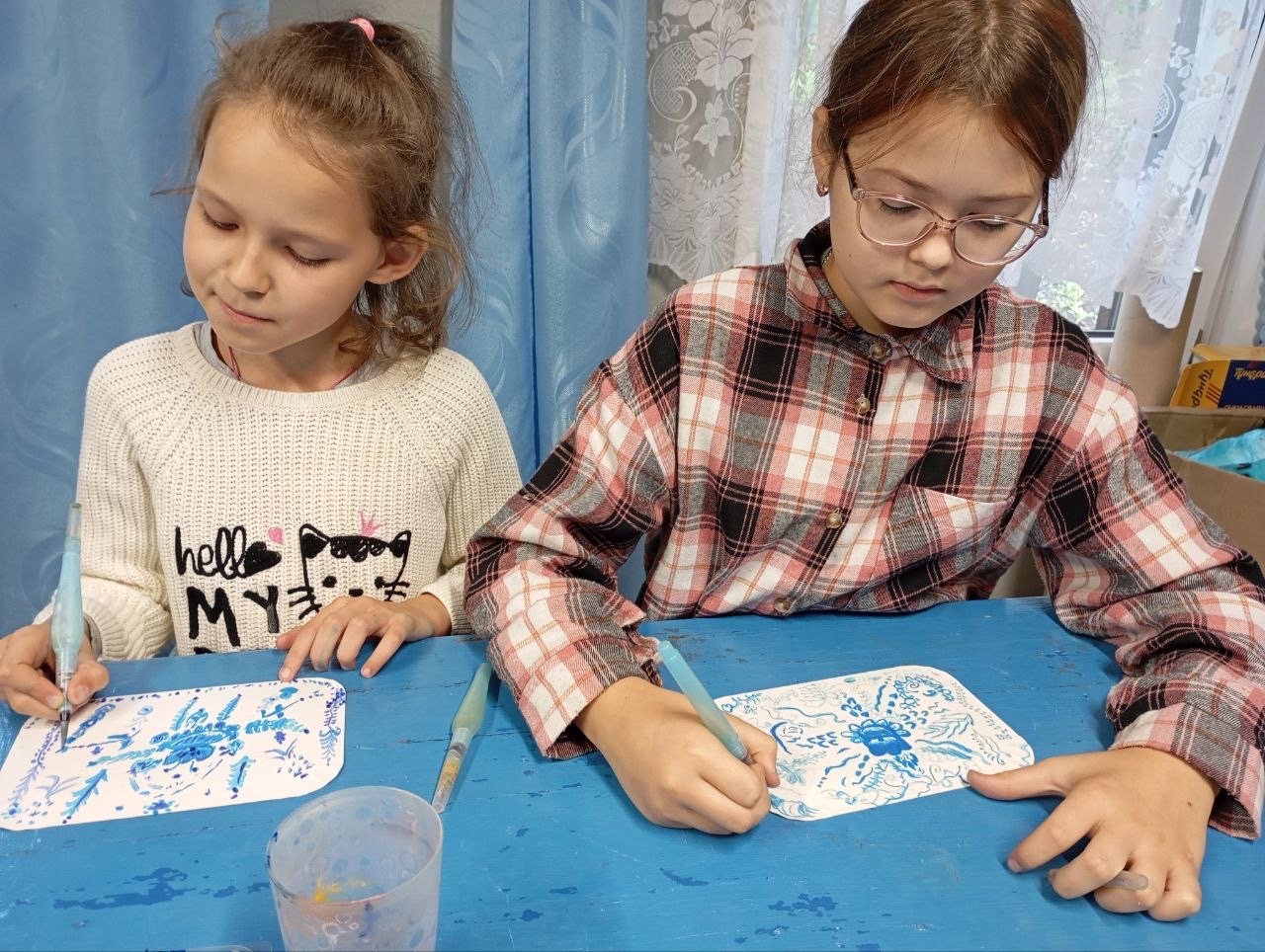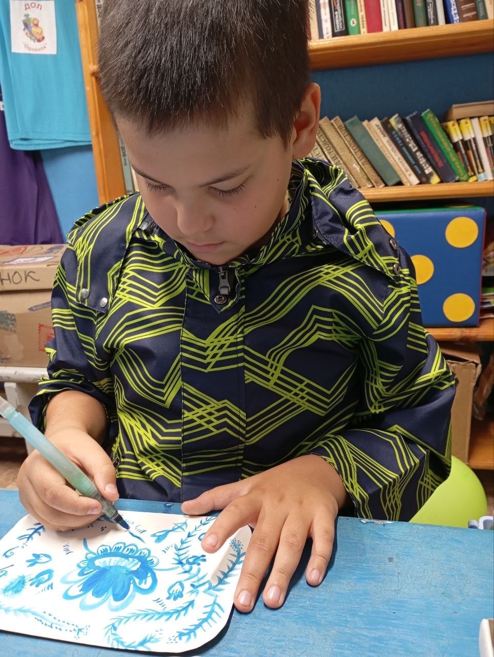 Сегодня маленькие очумельцы послушали сказку о братьях, расписавших белую шубу голубым орнаментом самому деду Трескуну, а потом попробовали создать свой орнамент в этой технике.