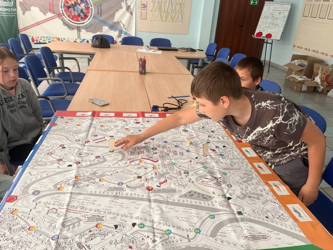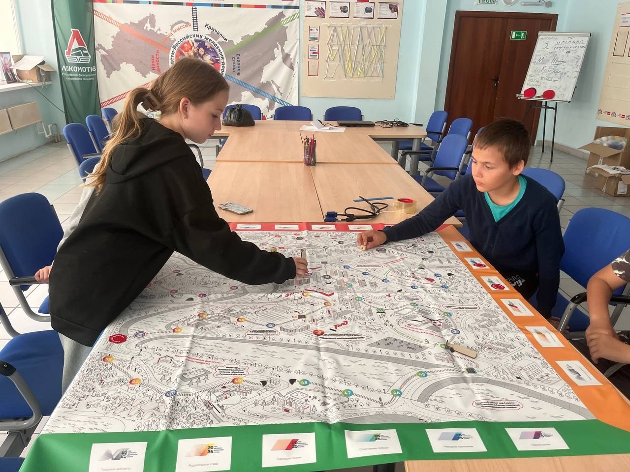 Ребята по очереди бросают кубик, передвигают фишки по игровому полю и получают карточки с заданиями.