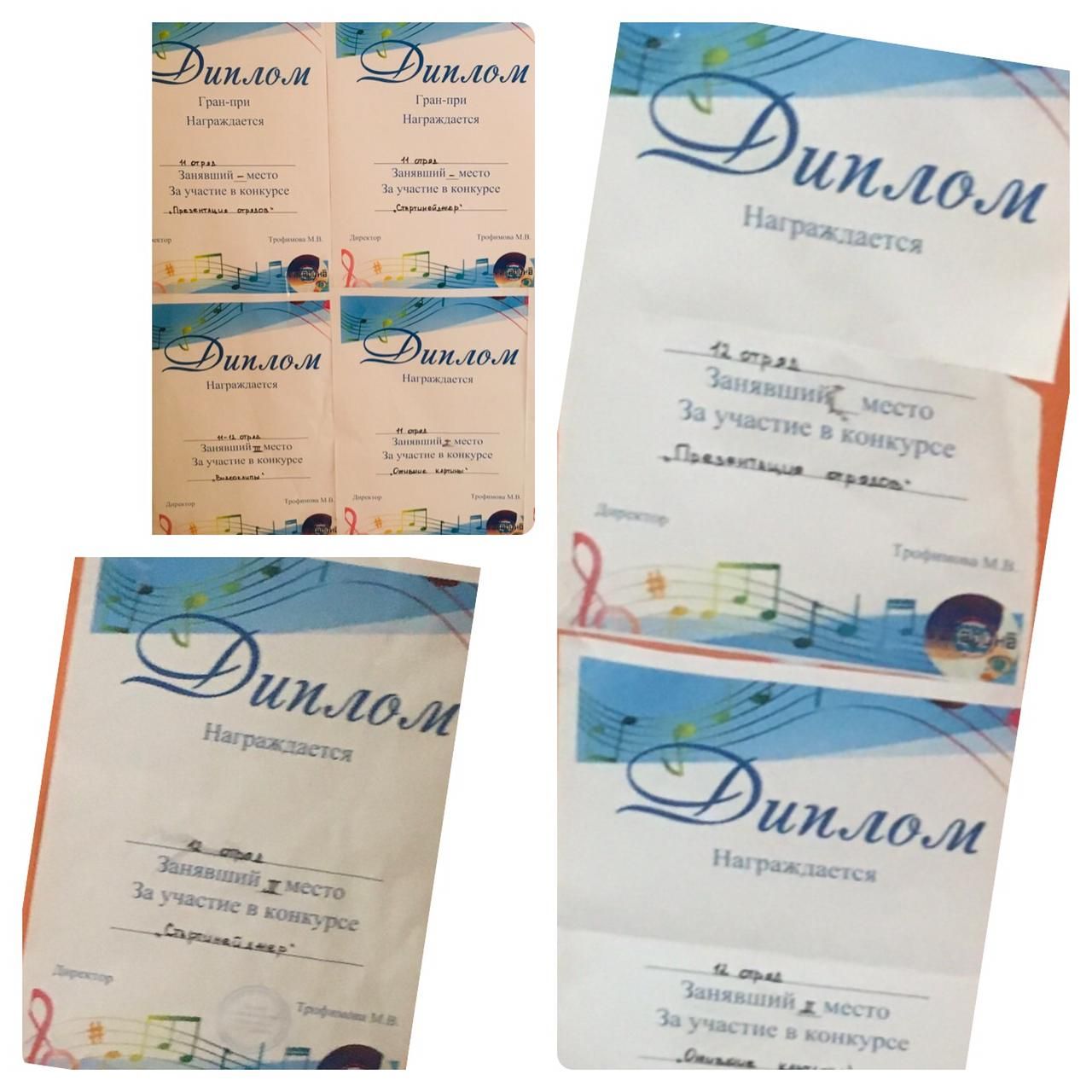 Наши отряды занимали призовые места в разных конкурсах, а именно: отряд 11, вожатые Байрамова Анастасия, Заморев Дмитрий получили "Гран-при" за участие в конкурсе « Презентация отрядов», за участие в конкурсе «Стартинейджер».