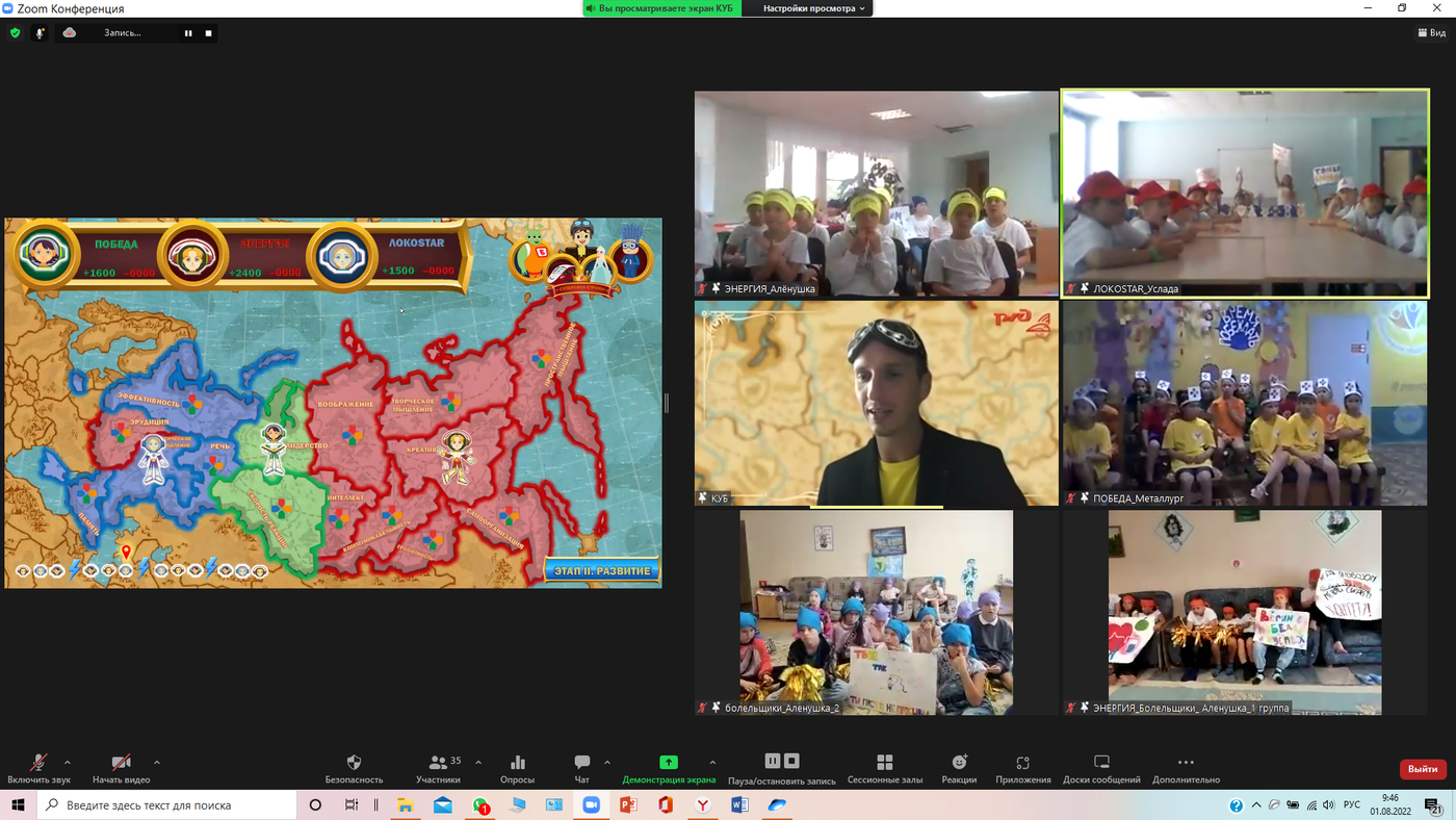 Первым игровым шагом был этап "Адаптация" и установки цитадели каждой детской командой игроков на карте новой КвадроЗемли. Каждая команда имела свой цвет территории, которую они осваивали и развивали. Ребята получали возможность освоения земель Эрудиция, Воображение, Лидерство, Логическое мышление, Речь, Творческое мышление, Креатив, Интеллект, Коммуникабельность, Эффективность, Грамотность, Пространственное мышление, Память. Продолжением "Адаптации" на новой территории были игровые задания на проверку логики, внимательности, смекалки и скорости реакции каждой команды. Игроки старались правильно ответить на не простые задачки и быстро отправить ответ в общий чат мероприятия.