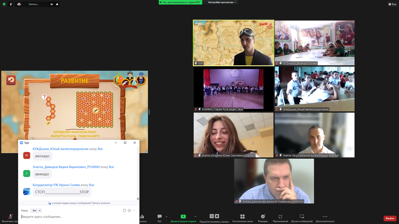 Финальный этап и объявление результатов конкретной игры завершилось ярким и патриотичным видеосюжетом о нашей большой и великой стране и Российских железных дорогах. На экране появлялись результаты оценки зрительского жюри каждой из трёх команд онлайн-игры. А общие результаты всех онлайн-игр Первого Дня Игры вы можете узнать из этой новости!