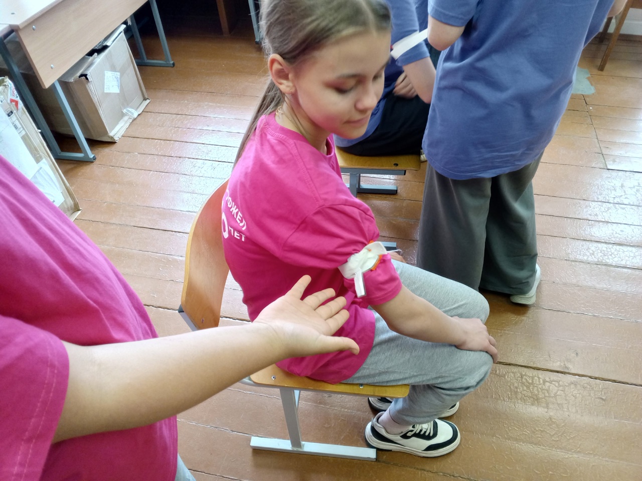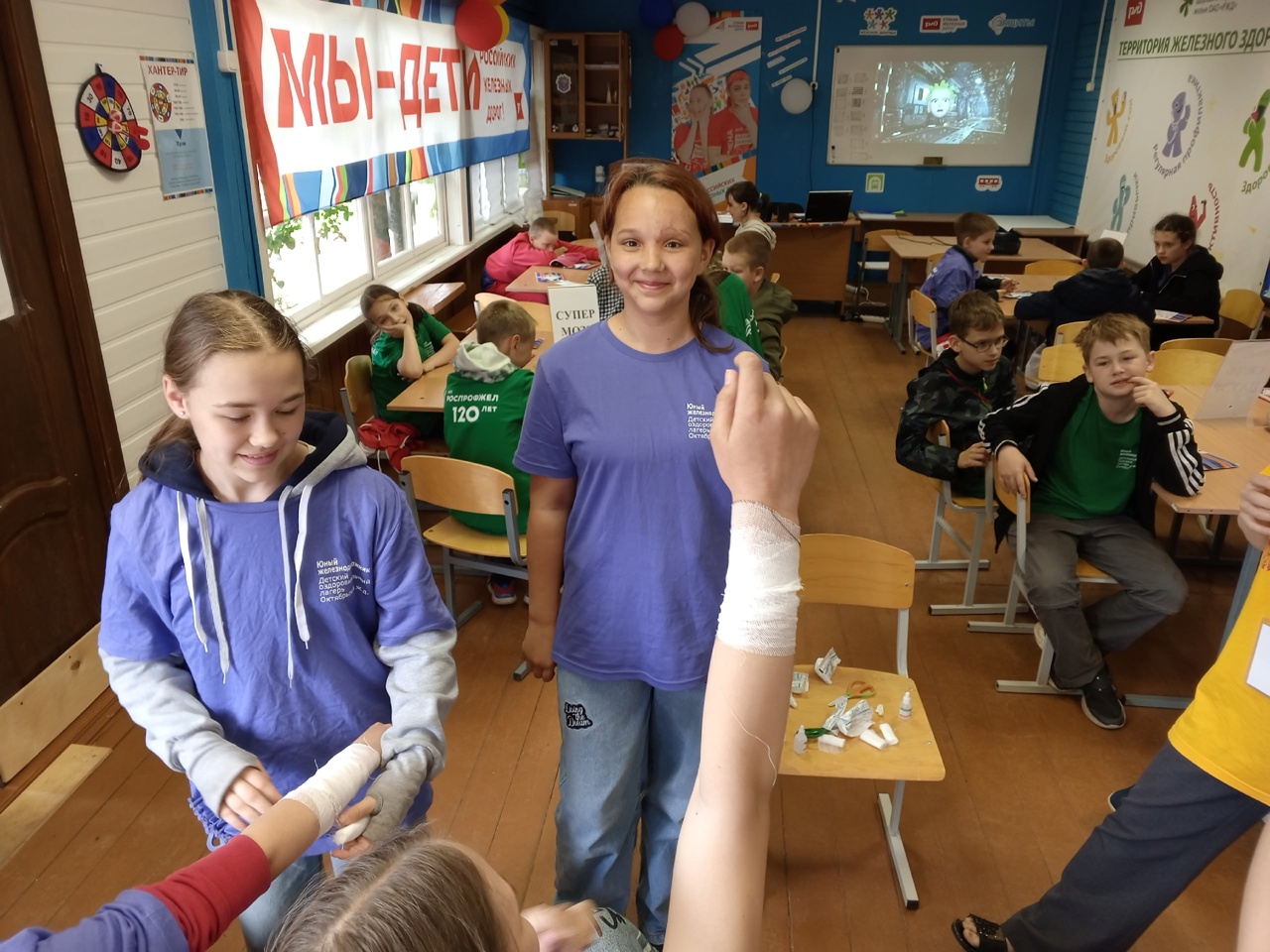 Был задан вопрос:Помогаете ли вы другу другу, если кому-то из вас нужна помощь? В ответ прозвучало ДА! И действительно, на занятии ребята показали, как нужно оказывать первую помощь ведь любой человек может столкнуться в повседневной жизни с ранами, ссадинами, порезами. Команды обрабатывали раны и накладывали повязки, накладывали жгут при артериальном кровотечении и накладывали повязку «варежка» при ожоге кисти. Все справились с заданиями, за что получили свои микрокристы для сборки основного кристалла.