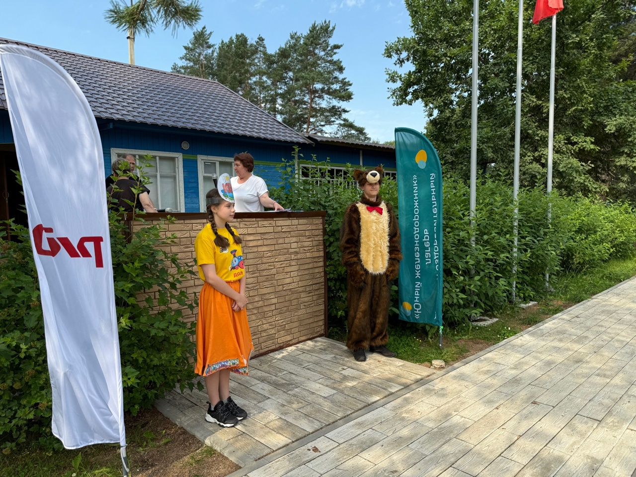 Медведь и девочка Южедешечка, пришли на линейку, чтобы пожелать всем удачи на соревнованиях.
