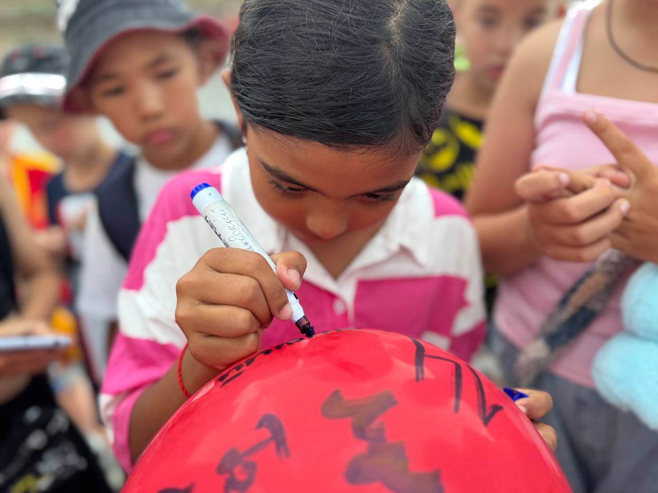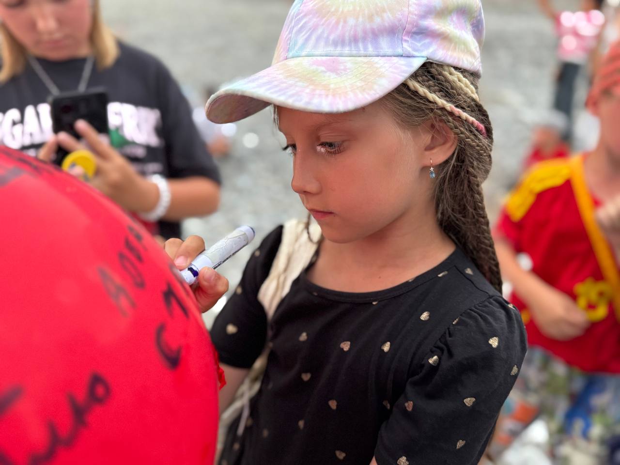 В руках у каждого отряда – воздушный шарик, надутый гелием. Шарики, исписанные детским почерком. Это – их послания в будущее, их самые сокровенные мечты и пожелания. Кто-то мечтает стать космонавтом, кто-то – врачом, кто-то – просто хочет, чтобы в мире всегда был мир.