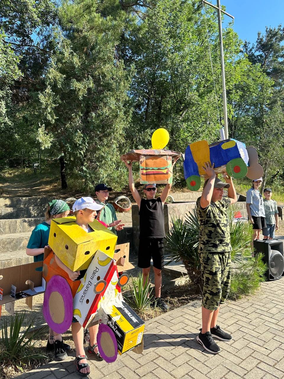 Маленькие фермеры и фермерши привели свои тракторы, комбайны и другие сельскохозяйственные машины из коробок и подручных материалов, чтобы показать их всему лагерю.